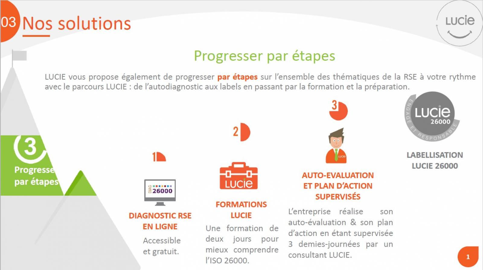 L’entreprise est la première concernée par la prise de conscience de sa responsabilité envers les générations futures sur les questions sociétales et environnementales. Si l’organisation / l’entreprise le souhaite, elle peut par la suite aller vers le Label Lucie 26000 en réalisant une évaluation sur site et en prenant un engagement de progrès. Une approche en trois étapes :